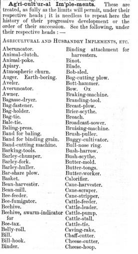 <HW> Ag`ri-cult`ur-al Im`ple-ments.</HW> <DEF> <P>These are treated, as fully as the limits will permit, under their respective heads; it is needless to repeat here the history of their progressive development or the order of their succession. See the following, under their respective heads: — <LIST> <HEAD>AGRICULTURAL AND HUSBANDRY IMPLEMENTS, ETC.</HEAD> <ITEM>Aberuncator.</ITEM> <ITEM>Animal-clutch.</ITEM> <ITEM>Animal-poke.</ITEM> <ITEM>Apiary.</ITEM> <ITEM>Atmospheric churn.</ITEM> <ITEM>Auger, Earth-boring</ITEM> <ITEM>Aveler</ITEM> <ITEM>Averuncator.</ITEM> <ITEM>Awner.</ITEM> <ITEM>Bagasse-dryer.</ITEM> <ITEM>Bag-fastener.</ITEM> <ITEM>Bag-holder.</ITEM> <ITEM>Bag-tie.</ITEM> <ITEM>Bale-tie.</ITEM> <ITEM>Baling-press.</ITEM> <ITEM>Band for baling.</ITEM> <ITEM>Band for binding grain.</ITEM> <ITEM>Band-cutting machine.</ITEM> <ITEM>Barking-tools.</ITEM> <ITEM>Barley-chumper.</ITEM> <ITEM>Barley-fork.</ITEM> <ITEM>Barley-huller.</ITEM> <ITEM>Bar-share plow.</ITEM> <ITEM>Basket.</ITEM> <ITEM>Bean-harvester.</ITEM> <ITEM>Bean-mill.</ITEM> <ITEM>Bee-feeder.</ITEM> <ITEM>Bee-fumigator.</ITEM> <ITEM>Beehive.</ITEM> <ITEM>Beehive, swarm-indicator for</ITEM> <ITEM>Bee-tax.</ITEM> <ITEM>Belly-roll.</ITEM> <ITEM>Bill.</ITEM> <ITEM>Bill-hook.</ITEM> <ITEM>Binder.</ITEM> <ITEM>Binding attachment for harvesters.</ITEM> <ITEM>Binot.</ITEM> <ITEM>Blade.</ITEM> <ITEM>Bob-sled.</ITEM> <ITEM>Bog-cutting plow.</ITEM> <ITEM>Bott-hammer.</ITEM> <ITEM>Bow, Ox</ITEM> <ITEM>Braking-machine</ITEM> <ITEM>Branding-tool.</ITEM> <ITEM>Breast-plow.</ITEM> <ITEM>Brier-scythe.</ITEM> <ITEM>Broach.</ITEM> <ITEM>Broadcast-sower.</ITEM> <ITEM>Bruising-machine.</ITEM> <ITEM>Brush-puller.</ITEM> <ITEM>Buggy-cultivator.</ITEM> <ITEM>Bull-nose ring.</ITEM> <ITEM>Bush-harrow.</ITEM> <ITEM>Bush-scythe.</ITEM> <ITEM>Butter-mold.</ITEM> <ITEM>Butter-tongs.</ITEM> <ITEM>Butter-worker.</ITEM> <ITEM>Calorifier.</ITEM> <ITEM>Cane-harvester.</ITEM> <ITEM>Cane-scraper.</ITEM> <ITEM>Cane-stripper.</ITEM> <ITEM>Cattle-feeder.</ITEM> <ITEM>Cattle-leader.</ITEM> <ITEM>Cattle-pump.</ITEM> <ITEM>Cattle-stall</ITEM> <ITEM>Cattle-tie.</ITEM> <ITEM>Caving-rake.</ITEM> <ITEM>Chaff-cutter.</ITEM> <ITEM>Cheese-cutter.</ITEM> <ITEM>Cheese-hoop.</ITEM> </LIST></P> </DEF> </E> |