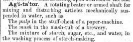 <HW>Ag`i-ta`tor.</HW> <DEF> <P>A rotating beater or armed shaft for mixing and disturbing articles mechanically suspended in water, such as <LIST> <ITEM>The <I>pulp</I> in the stuff-chest of a paper-machine.</ITEM> <ITEM>The <I>mash</I> in the mash-tub of a brewery.</ITEM> <ITEM>The mixture of starch, sugar, etc., and water, in the washing process of starch-making.</ITEM> </LIST> </P> </DEF> </E> |