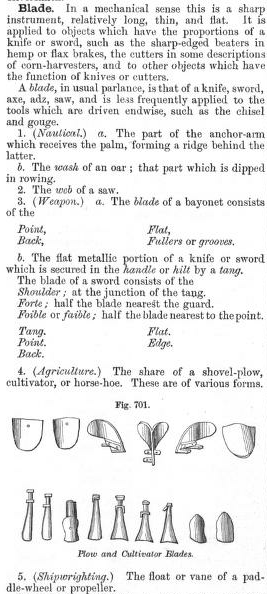 <HW>Blade.</HW> <DEF> <P>In a mechanical sense this is a sharp instrument, relatively long, thin, and flat. It is applied to objects which have the proportions of a knife or sword, such as the sharp-edged beaters in hemp or flax brakes, the cutters in some descriptions of corn-harvesters, and to other objects which have the function of knives or cutters.</P> <P>A <I>blade</I>, in usual parlance, is that of a knife, sword, axe, adz, saw and is less frequently applied to the tools which are driven endwise, such as the chisel and gouge.</P> <P>1. <LABEL>Nautical.</LABEL> a. The part of the anchor-arm which receives the palm, forming a ridge behind the latter.</P> <P>b. The <I>wash</I> of an oar; that part which is dipped in rowing.</P> <P>2. The <I>web</I> of a saw.</P> <P>3. <LABEL>Weapon.</LABEL> a. The <I>blade</I> of a bayonet consists of the <LIST> <ITEM><I>Point,</I></ITEM> <ITEM><I>Back,</I></ITEM> <ITEM><I>Flat,</I></ITEM> <ITEM><I>Fullers</I> or <I>grooves</I></ITEM> </LIST> </P> <P>b. The flat metallic portion of a knife or sword which is secured in the <I>handle</I> or <I>hilt</I> by a <I>tang.</I></P> <P>The blade of a sword conists of the <LIST> <ITEM><I>Shoulder;</I> at the junction of the tang.</ITEM> <ITEM><I>Forte;</I> half the blade nearest the guard.</ITEM> <ITEM><I>Foible</I> or <I>faible;</I> half the blade nearest the point.</ITEM> <ITEM>Tang.</ITEM> <ITEM>Point.</ITEM> <ITEM>Back.</ITEM> <ITEM>Flat.</ITEM> <ITEM>Edge.</ITEM> </LIST></P> <P>4. <LABEL>Agriculture.</LABEL> The share of a shovel-plow, cultivator, or horse-hoe. These are of various forms.</P> <FIGURE N="701"><HEAD>Plow and Cultivator Blades.</HEAD></FIGURE> <P>5. <LABEL>Shipwrighting.</LABEL> The float or vane of a paddle-wheel or propeller.</P> </DEF> </E> |